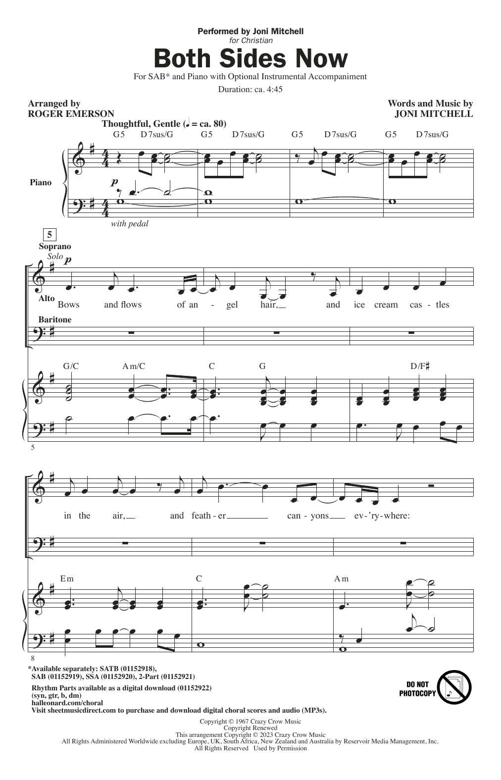 Download or print Joni Mitchell Both Sides Now (arr. Roger Emerson) sheet music, chords and digital score arranged for SAB Choir. This Folk score includes 11 page(s).