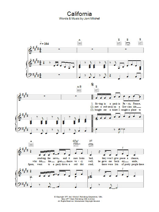 Download or print Joni Mitchell California sheet music, chords and digital score arranged for Piano, Vocal & Guitar Chords (Right-Hand Melody). This Pop score includes 5 page(s).