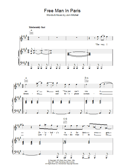 Download or print Joni Mitchell Free Man In Paris sheet music, chords and digital score arranged for Piano, Vocal & Guitar Chords (Right-Hand Melody). This Pop score includes 5 page(s).