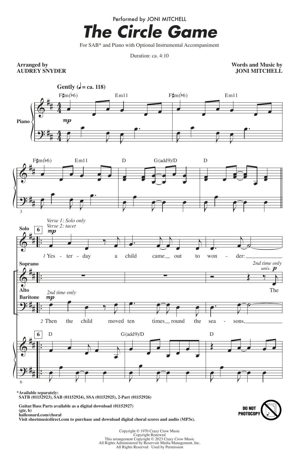 Download or print Joni Mitchell The Circle Game (arr. Audrey Snyder) sheet music, chords and digital score arranged for SAB Choir. This Pop score includes 13 page(s).