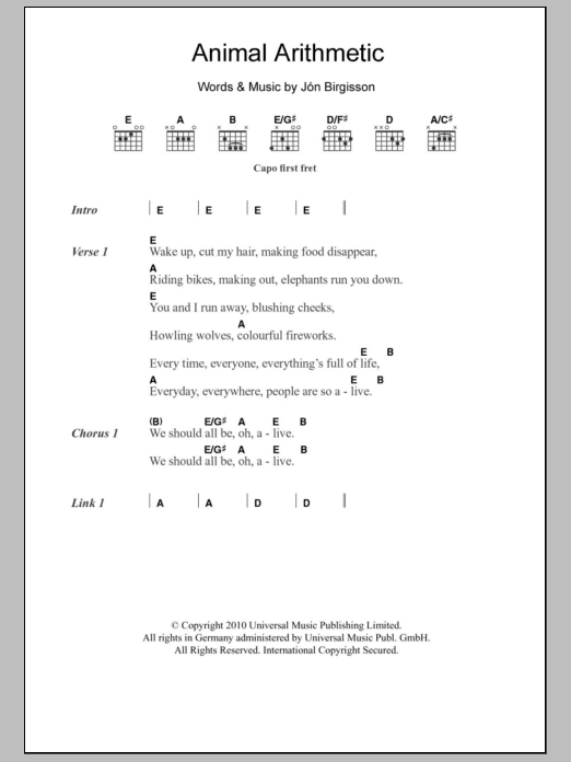 Download or print Jonsi Animal Arithmetic sheet music, chords and digital score arranged for Guitar Chords/Lyrics. This Pop score includes 3 page(s).