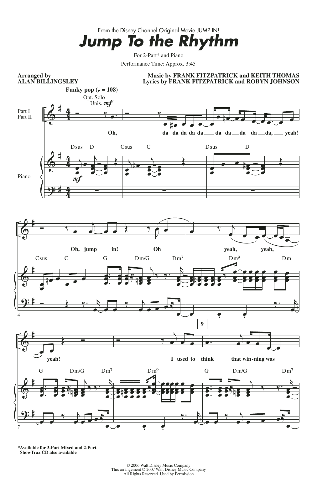 Download or print Jordan Pruitt Jump To The Rhythm (from Jump In!) (arr. Alan Billingsley) sheet music, chords and digital score arranged for 3-Part Mixed Choir. This Disney score includes 11 page(s).
