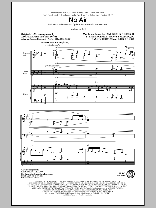 Download or print Jordin Sparks No Air (from Glee) (adapt. Alan Billingsley) sheet music, chords and digital score arranged for SAB Choir. This Pop score includes 17 page(s).