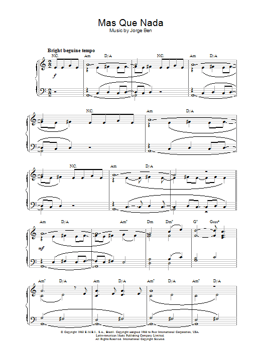 Download or print Jorge Ben Mas Que Nada sheet music, chords and digital score arranged for Piano Solo. This Latin score includes 4 page(s).