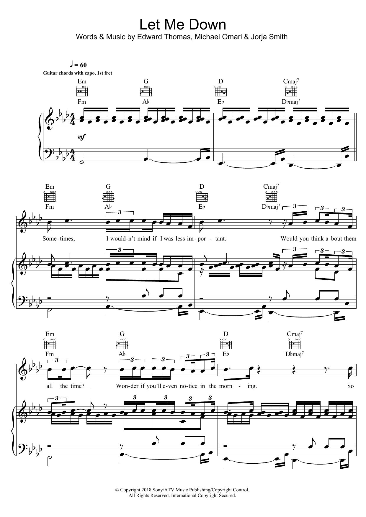 Download or print Jorja Smith Let Me Down (featuring Stormzy) sheet music, chords and digital score arranged for Piano, Vocal & Guitar Chords. This Hip-Hop score includes 9 page(s).