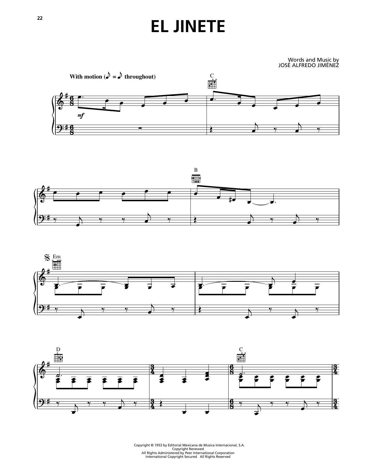 Download or print Jose Alfredo Jimenez El Jinete sheet music, chords and digital score arranged for Piano, Vocal & Guitar Chords (Right-Hand Melody). This Latin score includes 4 page(s).