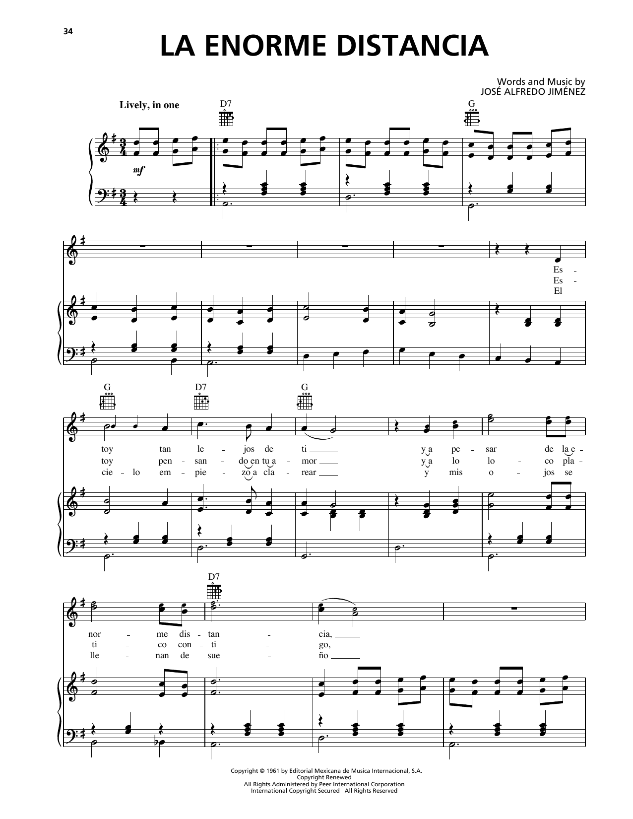 Download or print Jose Alfredo Jimenez La Enorme Distancia sheet music, chords and digital score arranged for Piano, Vocal & Guitar Chords (Right-Hand Melody). This Latin score includes 3 page(s).