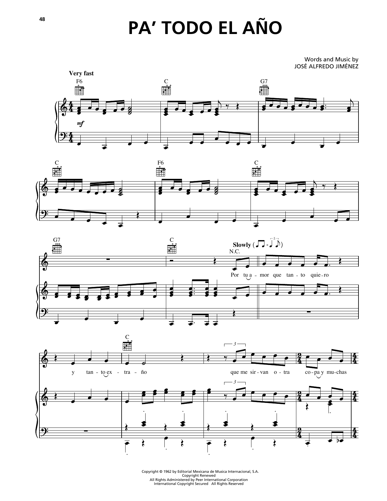 Download or print José Alfredo Jiménez Pa' Todo El Ano sheet music, chords and digital score arranged for Piano, Vocal & Guitar Chords (Right-Hand Melody). This Pop score includes 4 page(s).