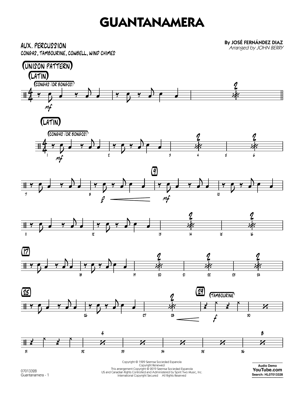 Download or print José Fernández Diaz Guantanamera (arr. John Berry) - Aux Percussion sheet music, chords and digital score arranged for Jazz Ensemble. This Jazz score includes 2 page(s).