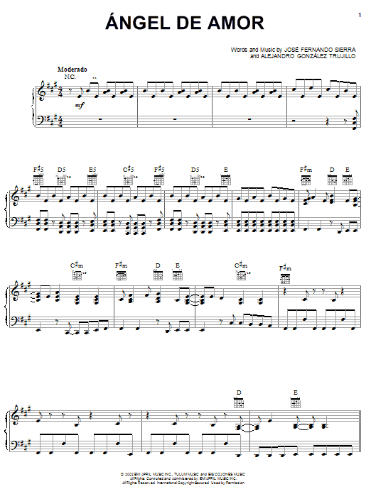 Download or print Jose Fernando Sierra Angel De Amor sheet music, chords and digital score arranged for Piano, Vocal & Guitar Chords (Right-Hand Melody). This Latin score includes 5 page(s).