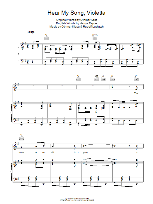 Download or print Josef Locke Hear My Song, Violetta sheet music, chords and digital score arranged for Piano, Vocal & Guitar Chords. This Standards score includes 6 page(s).