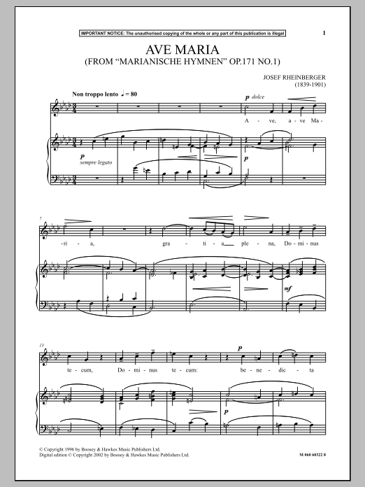 Download or print Josef Rheinberger Ave Maria, Op.171, No.1 (from Marianische Hymnen) sheet music, chords and digital score arranged for Piano & Vocal. This Classical score includes 4 page(s).