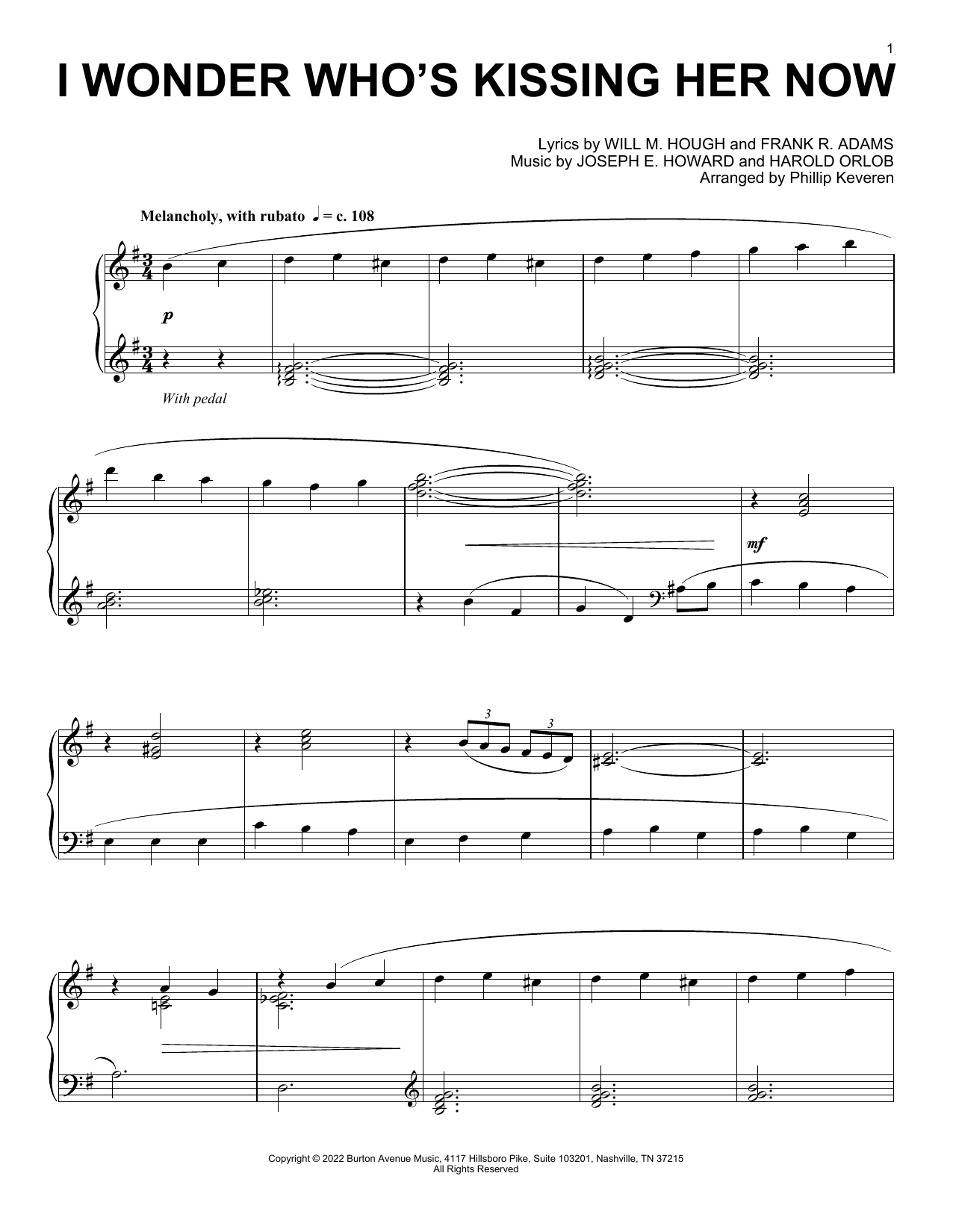 Download or print Joseph E. Howard I Wonder Who's Kissing Her Now (arr. Phillip Keveren) sheet music, chords and digital score arranged for Piano Solo. This Jazz score includes 3 page(s).