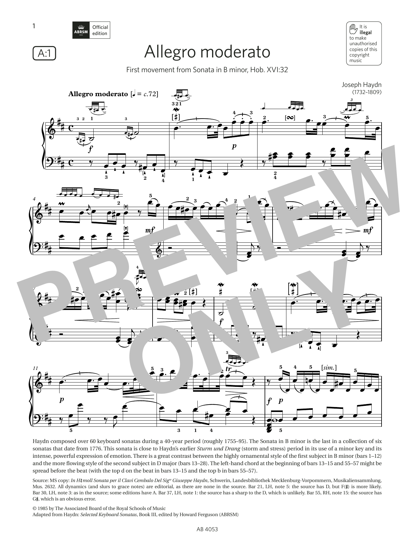 Download or print Joseph Haydn Allegro moderato (Grade 7, list A1, from the ABRSM Piano Syllabus 2023 & 2024) sheet music, chords and digital score arranged for Piano Solo. This Classical score includes 5 page(s).