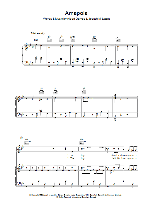Download or print Joseph M. Lacalle Amapola (Pretty Little Poppy) sheet music, chords and digital score arranged for Piano, Vocal & Guitar Chords (Right-Hand Melody). This Latin score includes 3 page(s).