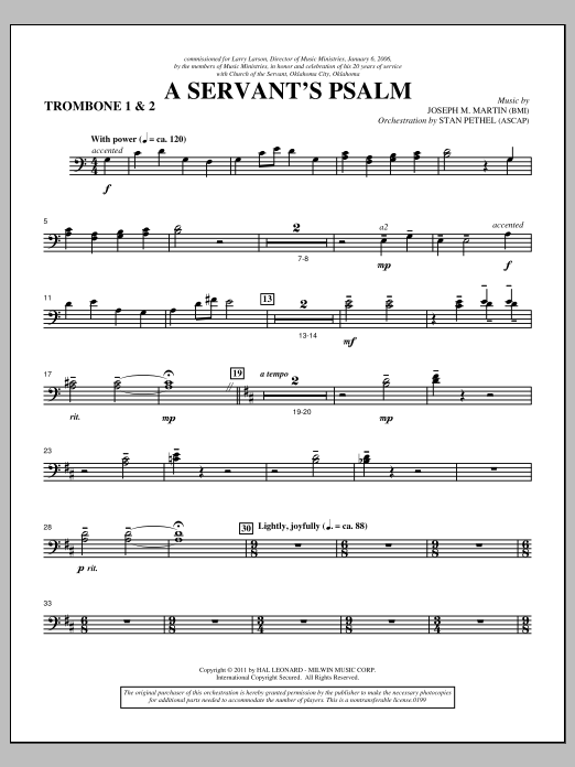 Download or print Joseph M. Martin A Servant's Psalm - Trombone 1 & 2 sheet music, chords and digital score arranged for Choir Instrumental Pak. This Concert score includes 3 page(s).