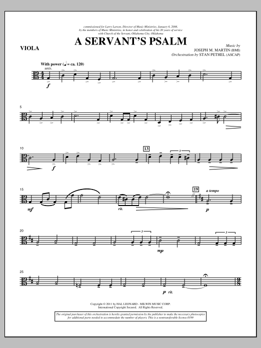 Download or print Joseph M. Martin A Servant's Psalm - Viola sheet music, chords and digital score arranged for Choir Instrumental Pak. This Concert score includes 4 page(s).