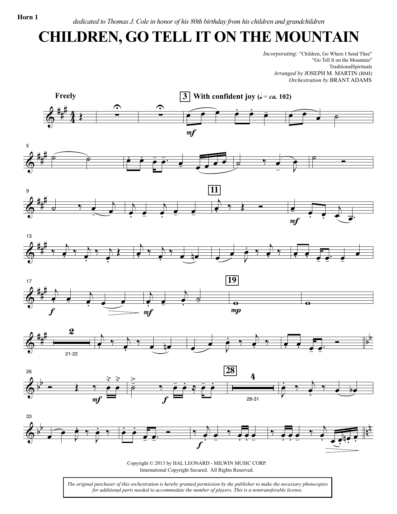Download or print Joseph M. Martin Children, Go Tell It on the Mountain - F Horn 1 sheet music, chords and digital score arranged for Choir Instrumental Pak. This Concert score includes 2 page(s).