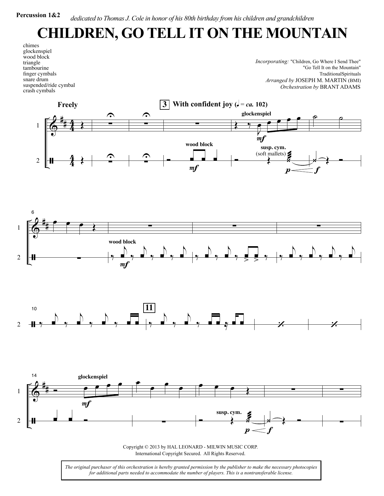 Download or print Joseph M. Martin Children, Go Tell It on the Mountain - Percussion 1 & 2 sheet music, chords and digital score arranged for Choir Instrumental Pak. This Concert score includes 4 page(s).