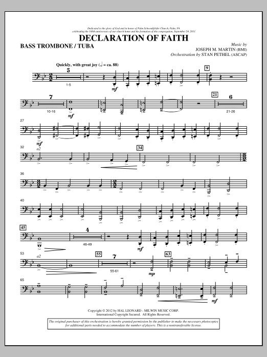 Download or print Joseph M. Martin Declaration Of Faith - Bass Trombone/Tuba sheet music, chords and digital score arranged for Choir Instrumental Pak. This Christian score includes 2 page(s).