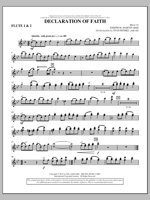 Download or print Joseph M. Martin Declaration Of Faith - Flute 1 & 2 sheet music, chords and digital score arranged for Choir Instrumental Pak. This Christian score includes 3 page(s).