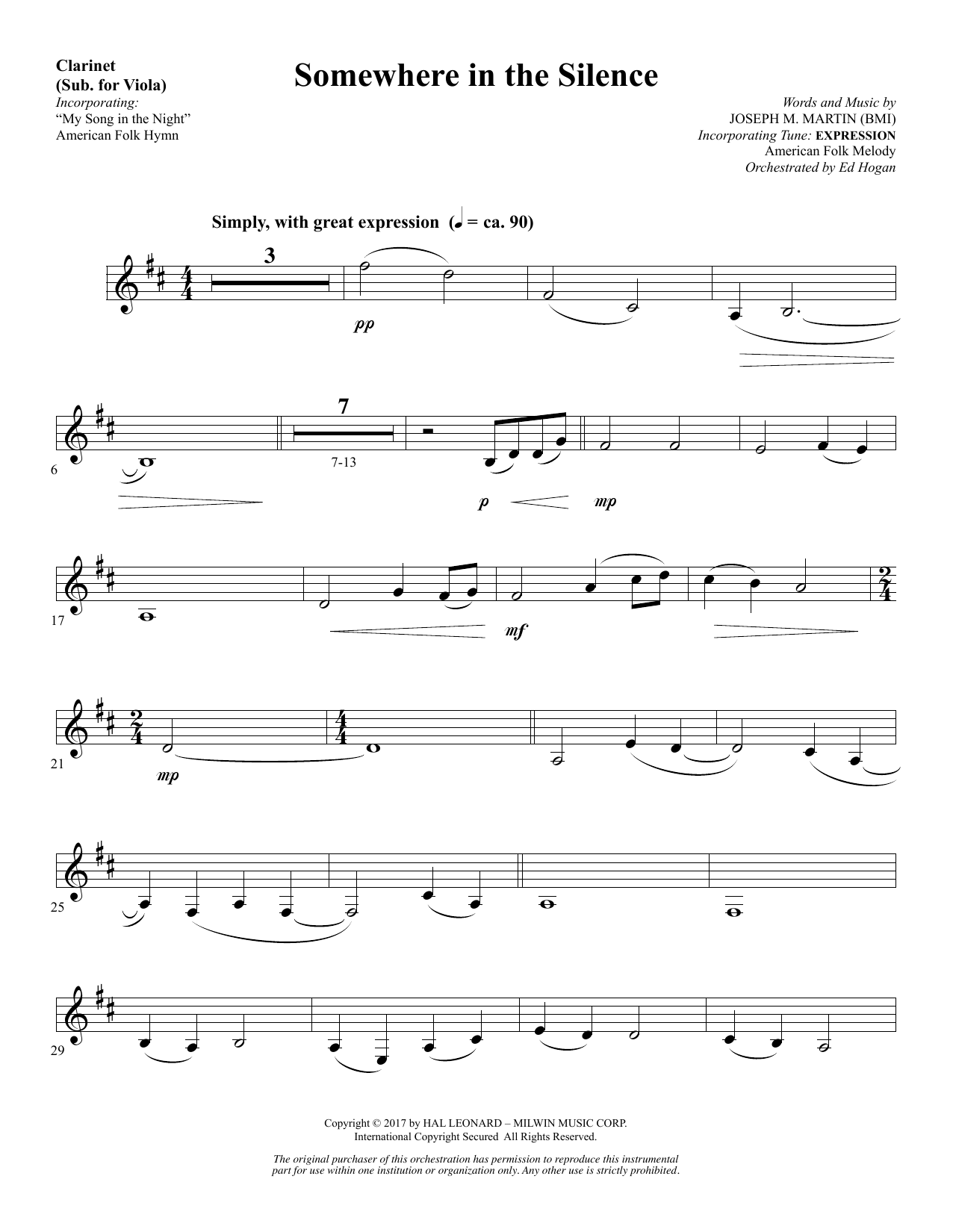 Download or print Joseph M. Martin Somewhere in the Silence - Clarinet (sub Viola) sheet music, chords and digital score arranged for Choir Instrumental Pak. This Sacred score includes 3 page(s).