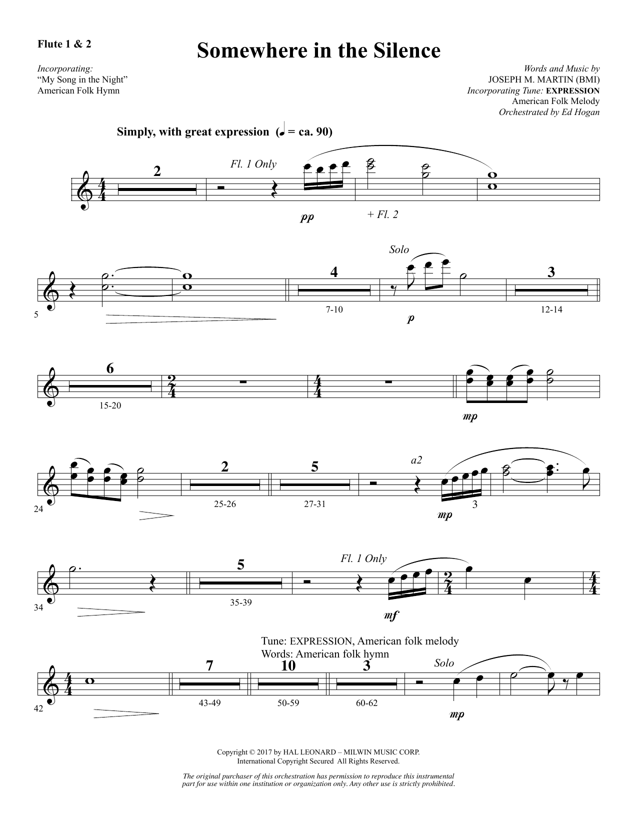 Download or print Joseph M. Martin Somewhere in the Silence - Flute 1 & 2 sheet music, chords and digital score arranged for Choir Instrumental Pak. This Sacred score includes 2 page(s).