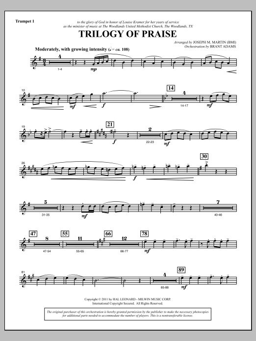 Download or print Joseph M. Martin Trilogy Of Praise - Bb Trumpet 1 sheet music, chords and digital score arranged for Choir Instrumental Pak. This Concert score includes 2 page(s).
