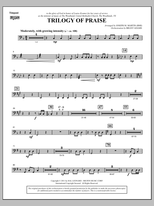 Download or print Joseph M. Martin Trilogy Of Praise - Timpani sheet music, chords and digital score arranged for Choir Instrumental Pak. This Concert score includes 2 page(s).