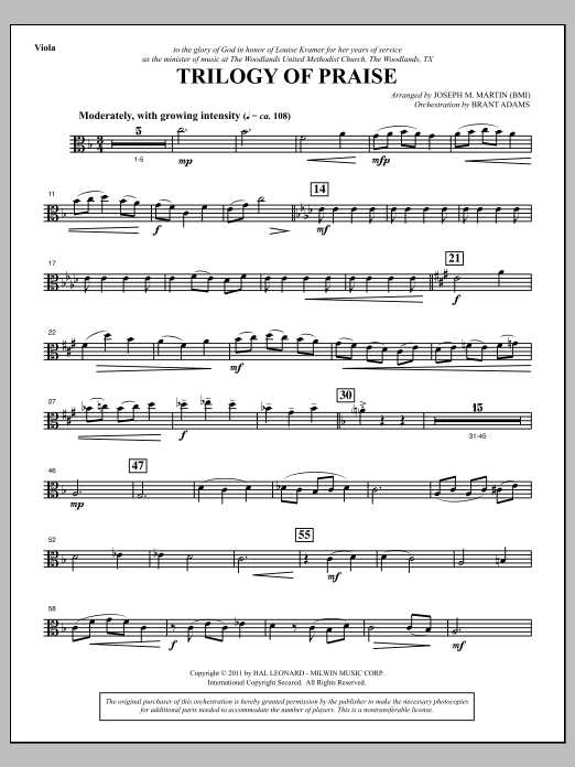 Download or print Joseph M. Martin Trilogy Of Praise - Viola sheet music, chords and digital score arranged for Choir Instrumental Pak. This Concert score includes 3 page(s).