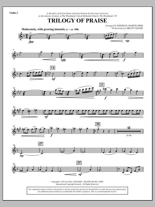 Download or print Joseph M. Martin Trilogy Of Praise - Violin 2 sheet music, chords and digital score arranged for Choir Instrumental Pak. This Concert score includes 4 page(s).