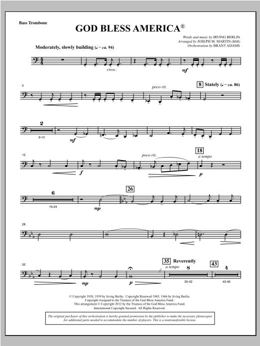 Download or print Joseph Martin God Bless America - Bass Trombone sheet music, chords and digital score arranged for Choir Instrumental Pak. This Patriotic score includes 2 page(s).