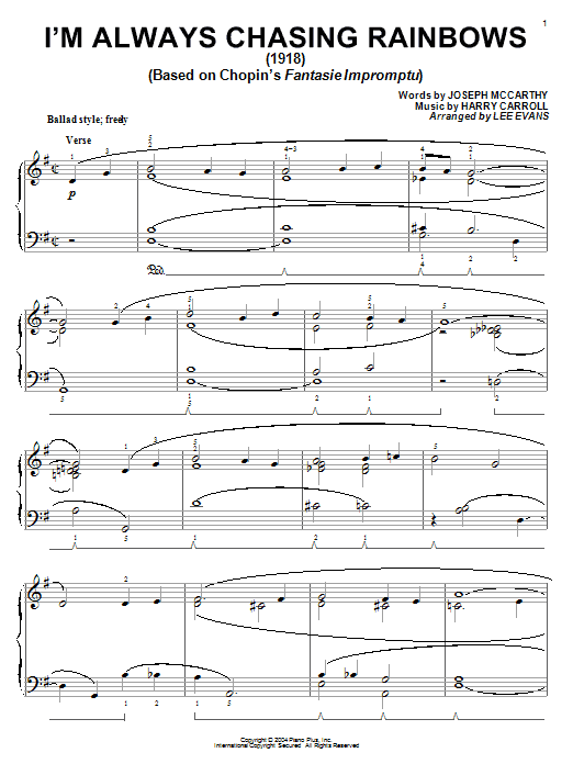 Download or print Joseph McCarthy I'm Always Chasing Rainbows sheet music, chords and digital score arranged for Piano Solo. This Musical/Show score includes 5 page(s).