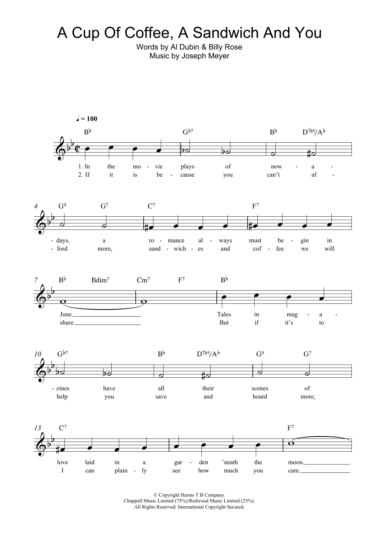 Download or print Joseph Meyer A Cup Of Coffee, A Sandwich And You sheet music, chords and digital score arranged for Piano, Vocal & Guitar Chords. This Standards score includes 5 page(s).