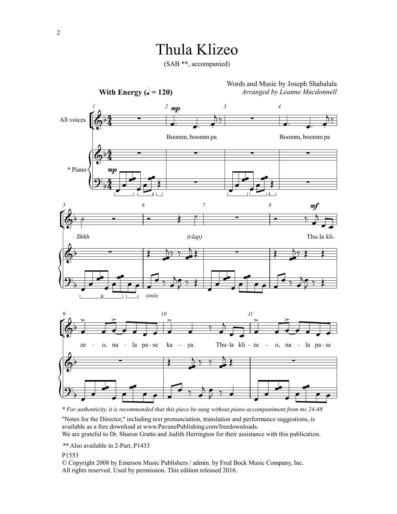 Download or print Joseph Shabala Thula Klizeo sheet music, chords and digital score arranged for SAB Choir. This Concert score includes 7 page(s).