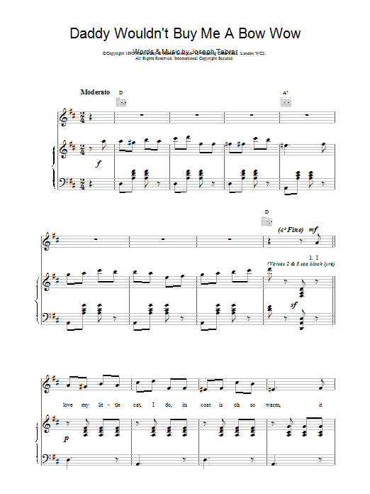 Download or print Joseph Tabrar Daddy Wouldn't Buy Me A Bow-Wow sheet music, chords and digital score arranged for Lead Sheet / Fake Book. This Traditional score includes 2 page(s).