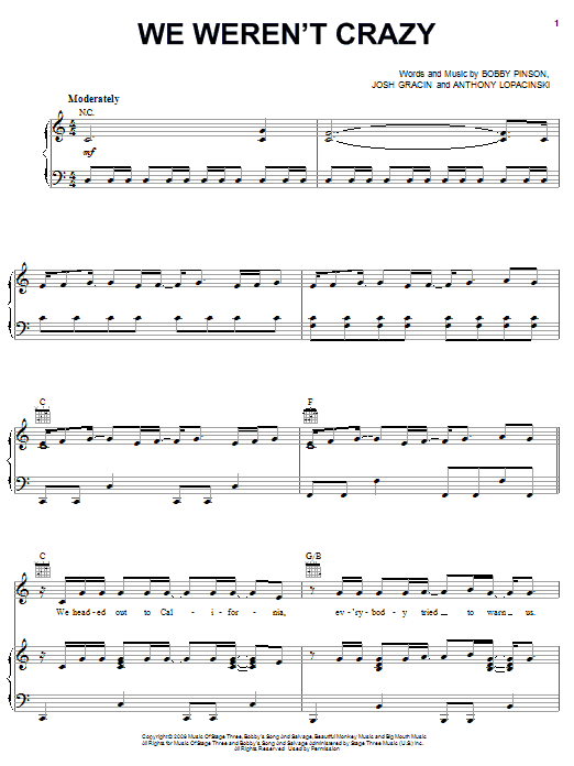 Download or print Josh Gracin We Weren't Crazy sheet music, chords and digital score arranged for Piano, Vocal & Guitar Chords (Right-Hand Melody). This Country score includes 7 page(s).