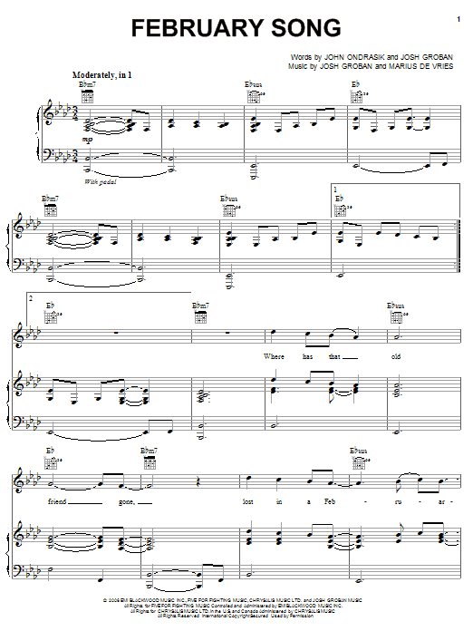 Download or print Josh Groban February Song sheet music, chords and digital score arranged for Piano & Vocal. This Pop score includes 10 page(s).