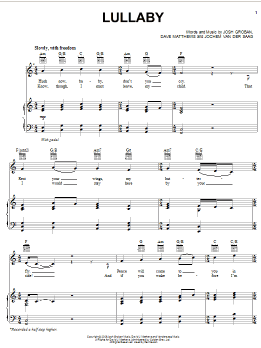 Download or print Josh Groban Lullaby sheet music, chords and digital score arranged for Easy Piano. This Pop score includes 3 page(s).