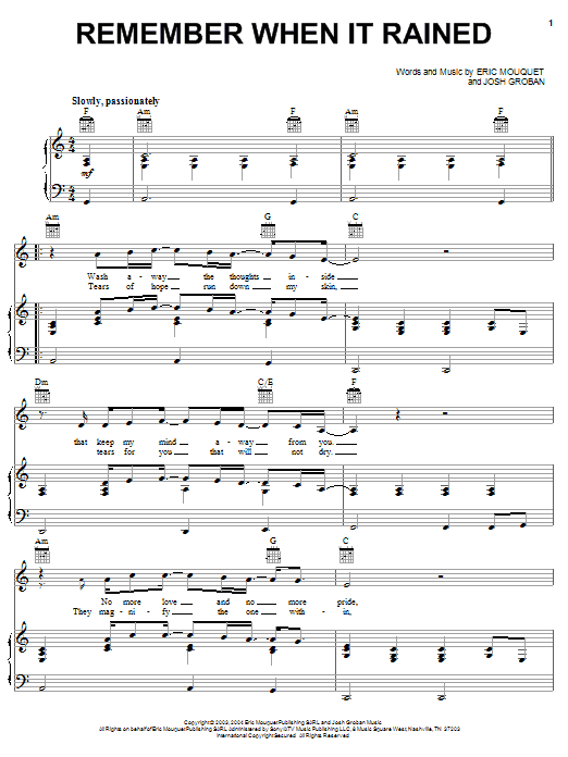Download or print Josh Groban Remember When It Rained sheet music, chords and digital score arranged for Easy Piano. This Pop score includes 4 page(s).