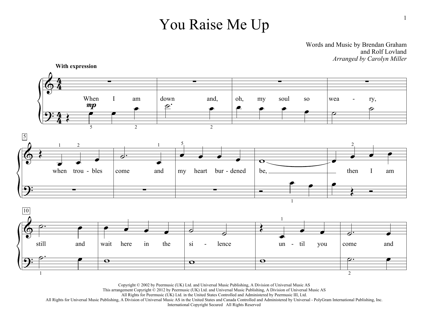 Download or print Carolyn Miller You Raise Me Up sheet music, chords and digital score arranged for Educational Piano. This Pop score includes 2 page(s).