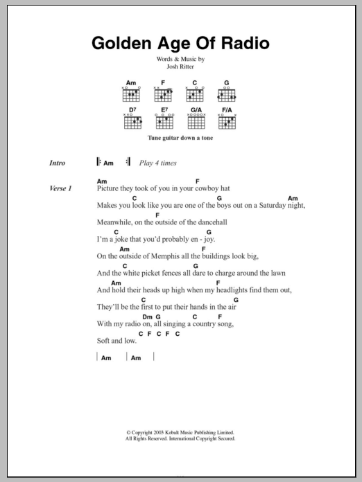 Download or print Josh Ritter Golden Age Of Radio sheet music, chords and digital score arranged for Guitar Chords/Lyrics. This Rock score includes 3 page(s).