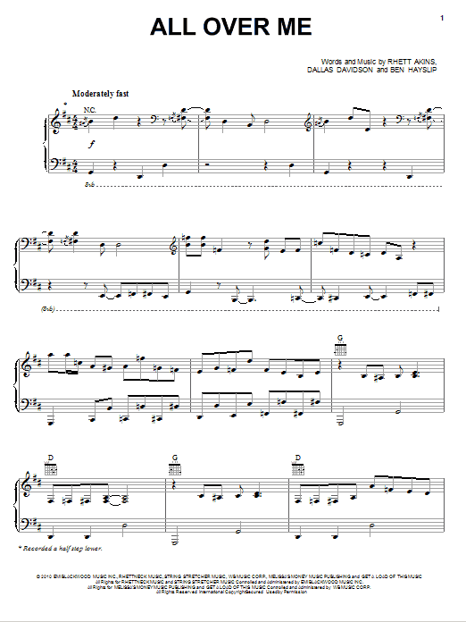 Download or print Josh Turner All Over Me sheet music, chords and digital score arranged for Piano, Vocal & Guitar Chords (Right-Hand Melody). This Country score includes 7 page(s).