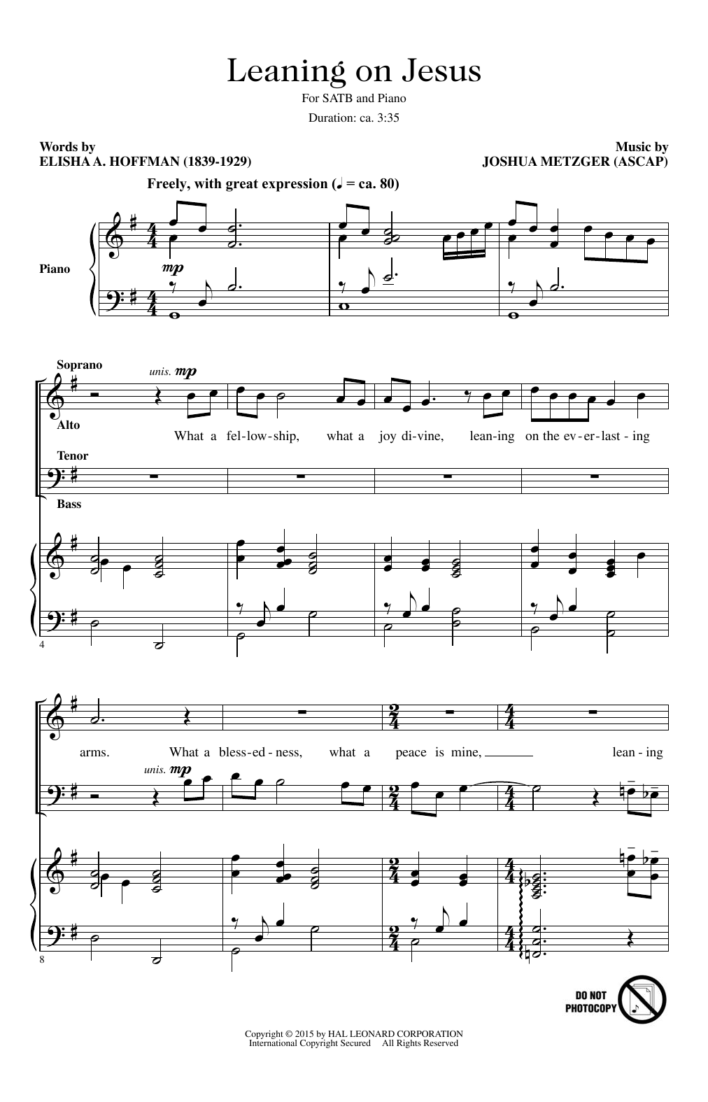 Download or print Joshua Metzger Leaning On Jesus sheet music, chords and digital score arranged for SATB Choir. This Hymn score includes 7 page(s).