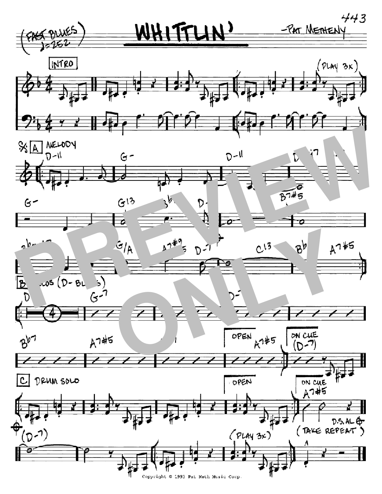 Download or print Pat Metheny Whittlin' sheet music, chords and digital score arranged for Real Book – Melody & Chords – C Instruments. This Jazz score includes 1 page(s).