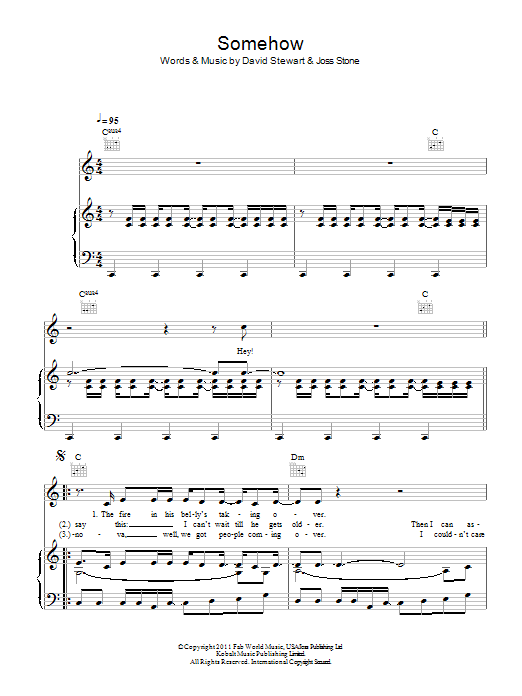 Download or print Joss Stone Somehow sheet music, chords and digital score arranged for Piano, Vocal & Guitar Chords. This Soul score includes 6 page(s).
