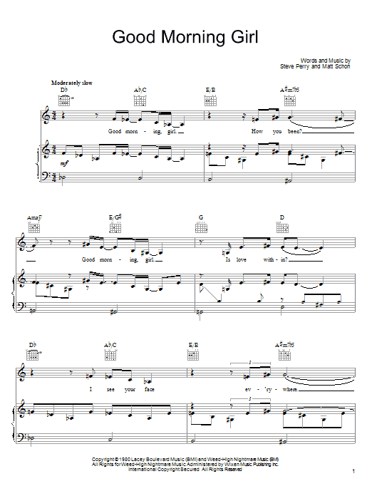 Download or print Journey Good Morning Girl sheet music, chords and digital score arranged for Easy Piano. This Rock score includes 3 page(s).