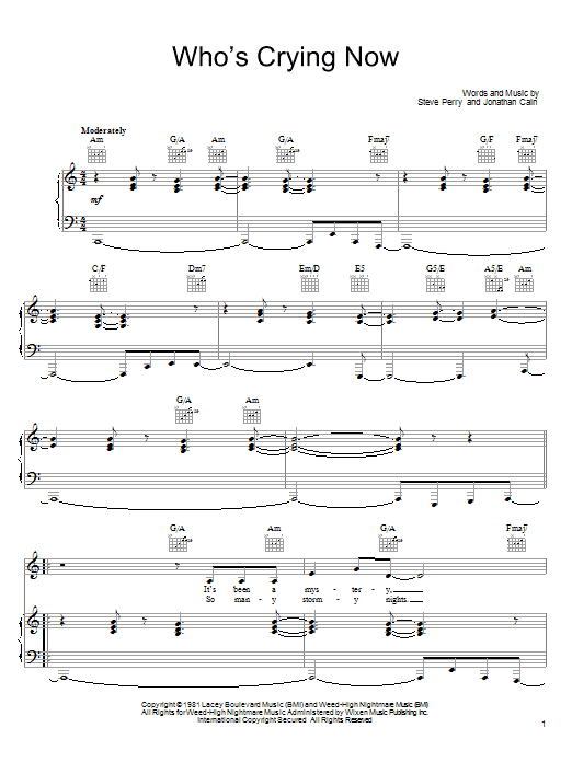 Download or print Journey Who's Crying Now sheet music, chords and digital score arranged for Guitar Tab. This Pop score includes 8 page(s).