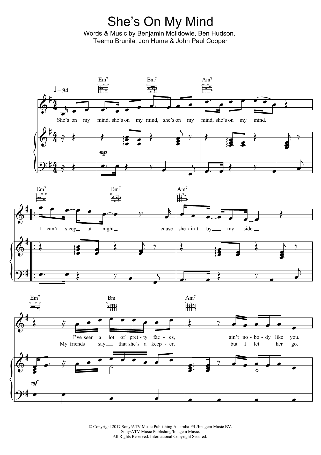 Download or print JP Cooper She's On My Mind sheet music, chords and digital score arranged for Piano, Vocal & Guitar Chords. This Pop score includes 5 page(s).