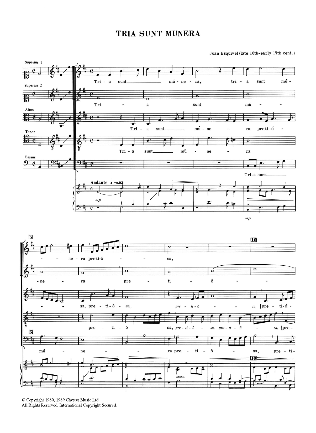Download or print Juan Esquivel Tria Sunt Munera sheet music, chords and digital score arranged for SATB Choir. This Inspirational score includes 3 page(s).